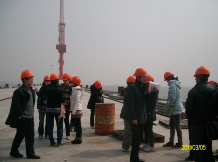 上午在海新辦公樓三樓會議室,公司副總工程師袁凌軍給同學(xué)們介紹了海新船務(wù)重工的整體布局,按碼頭、堆場、廠房、船塢工程順序介紹了施工關(guān)鍵難題和新技術(shù)應(yīng)用、施工設(shè)備情況。接著袁副總工帶同學(xué)們到現(xiàn)場做具體介紹。中午同學(xué)們在公司總部用餐,稍作休息后,由公司副總經(jīng)理張亞峰帶領(lǐng)去新通海沙項(xiàng)目部。張副總給同學(xué)們介紹了長江駁岸吹填工程的施工情況和工程設(shè)備。