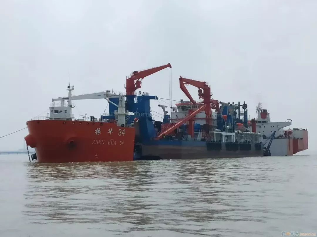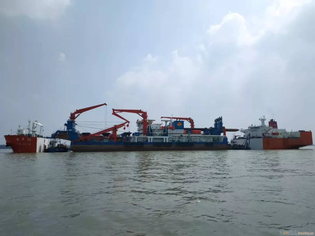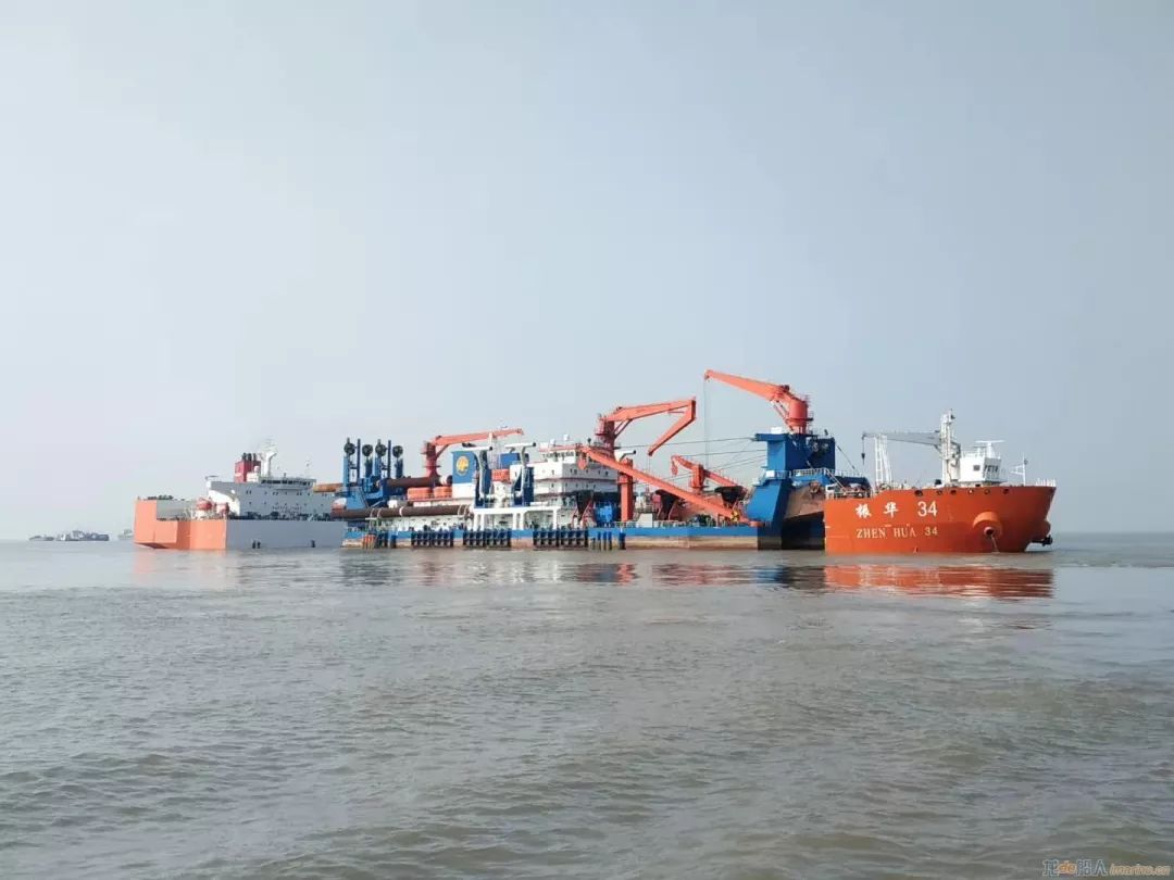 由江蘇海宏建設工程有限公司投資,江蘇海新重工建造的全球領先的非自航絞吸式挖泥船“新海騰”,在南通狼山錨地由“振華34”半潛裝載,奔赴孟加拉參與“一帶一路”沿線國家的碼頭和港口建設。