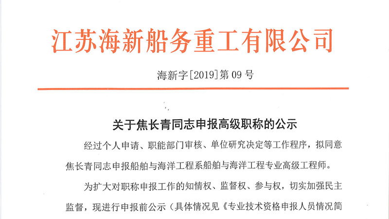 2019年08月15日,關(guān)于我司焦長青同志申報(bào)高級職稱的公示...